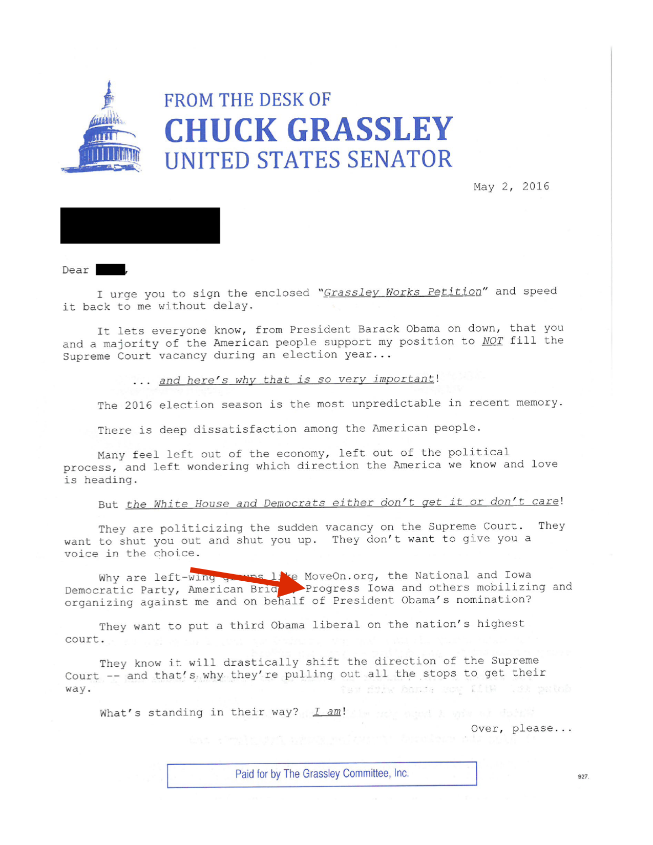 Senator Chuck Grassley is coming after Progress Iowa, and we need your help to fight back. The Senator has been engaging in unprecedented obstruction of President Obama's Supreme Court nominee, refusing to even hold a hearing in the Judiciary Committee, where he serves as Chair.